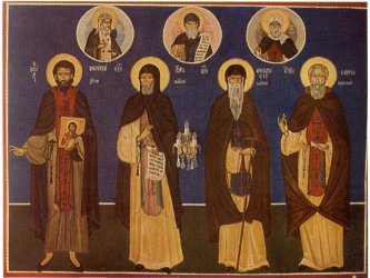 bottom row: Moisei Uhrin, Jov Pochaievskiy, Teodosiy Pecherskiy, Serhiy Radonezhskiy