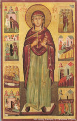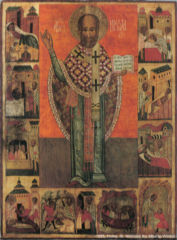 The requirements made of the icon by theology generated a specific artistic language and workshop practice quite different to what was current in Western art. The greatest importance was attributed to the figures of the saints depicted in the icons and their faces, which were to be free of the earthly reality, subjected to apotheosis and uncorporea , with no lifelike gestures, always in a frontal arrangement and with the preservation of symmetry. Their eyes were to be directed at the observer, which was to facilitate the establishment of contact through prayer. On the other hand in the icons presenting hagiographies (life-stories of the saints), the episodes from their lives and miracles would be separated off from the central figure by a definition of the time and space in which these events occurred. As opposed to the central figure, the hagiographic presentations would not correspond to the time and place of the praying observer; they would be narrative and illustrative in character. This dichotomy in the hagiographic icons would be augmented by the kovcheg border, marking off the concave, deeper level of the central panel, and its far-reaching consequences for the icon's structure and composition. The peripheral scenes could contain elements of architecture and landscape which would be much more elaborate than what might have occurred in the central panel if the iconography of the figure portrayed called for it. Nevertheless the landscape elements in icons would always be restricted to the hills and palat idiosyncratic of the icon, so unrealistic and deformed as to have an existence restricted merely to the micro-cosmos of the icon, and meaningless or even unidentifiable if removed from it. If any depiction of reality is to be seen in the icon, then it can only be of the evangelical reality, and in the context of the whole icon, the individual parts of which should always be subordinated to the whole entity. The deformation of its landscape and architectural items was an outcome of the application of the "inverted perspective of meaning," whereby the size of the figures and backgrounds portrayed represented their relative status in terms of significance. Meaning perspective also affected the relative magnitudes of the objects shown in an icon, which would be limited only to those absolutely essential . They would diminish in size the further away they were from the center of the icon. The architecture would be shown both from within and from an external view, the latter of which tended to be located in the icon's peripheries. Such treatment does not give a full presentation of the architecture; it delineates the boundaries between the sensual and extra-sensual world; but it also eliminates the need for frameworks, since the external views of the architecture provided the natural frames for the icon. The well-nigh-ubiquitous gold in the icon, its "standard fixture," shows an extra-sensual reality. The gold of the icons is treated as a representation of the glory of the martyrs, a reflection of the divine energy and a paradise unblemished by worthlessness or sin. Gold would also mark out the icon's internal boundaries. The use of gold as an outline for the robes of the saints and the chrysography (gold patterning) of the robes themselves indicates the fact that the saints dwell in the "better world." The colors of the icons are few, and their meanings symbolic. A characteristic feature of icons is that they have no play of light and shadow. Neither do they show the source of the light in them, since it is this light that builds up the icons themselves.